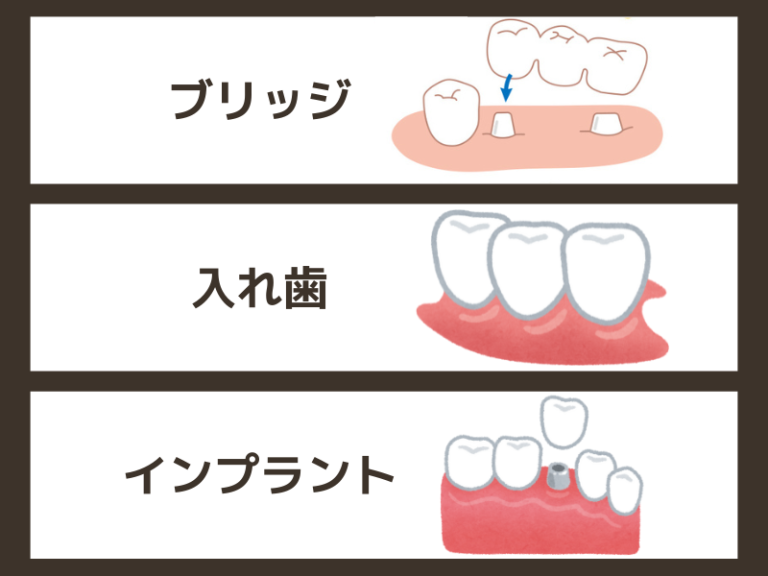 歯を失ったときの治療法には、インプラントのほかに「ブリッジ」や「入れ歯」の選択肢があります。